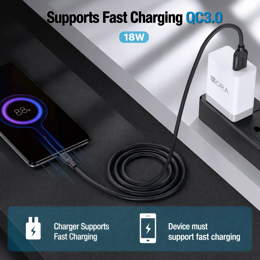 USB micro USB cable supports fast charging. If your device supports fast charging with a fast charging head, you can reach 18 W (5 V/3 A, 9 V/2 A, 12 V/1.5 A) of fast charging transmission power.