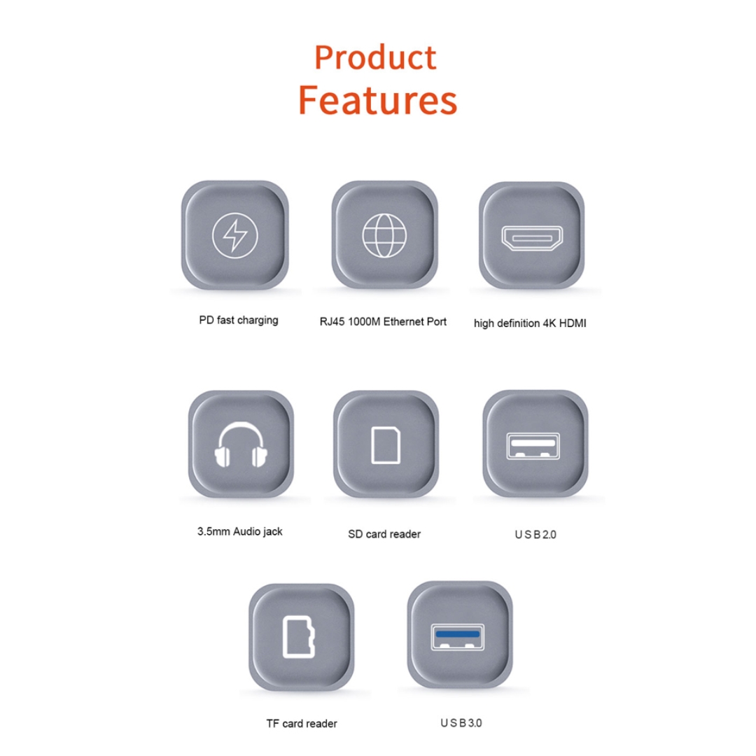 USB3.0*3 + USB2.0*3 + HDMI + SD + TF + Type-C + LAN + 3.5mm Audio Jack Smart Temperature Control – With Build-In Smart Chips And Exclusive Multi – Protection Systems To Avoid Over-Current, Over-Voltage, Short Circuit And High-Temperature For Security And Excellent Performance.